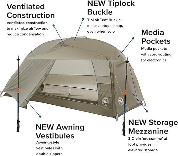 • Features new proprietary tent corner construction with TipLok Tent Buckleâ„¢ to streamline tent setup by combining three functions: secure pole-tip capture, rainfly attachment and tensioner, and stake-out loop.